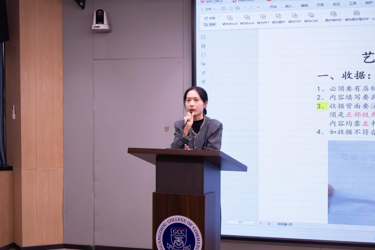 第一节培训课的主题为“报账与报销”。蓝喜为同学们讲解报销注意事项,详细梳理了收据、发票的开具填写要求,明确纸质版材料的打印规范,通过案例解析和易错点提醒,帮骨干们厘清财务流程中的模糊地带,助力同学们高效完成报销流程。