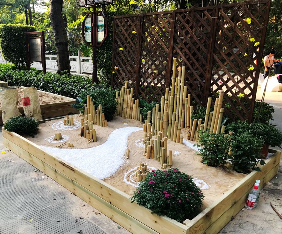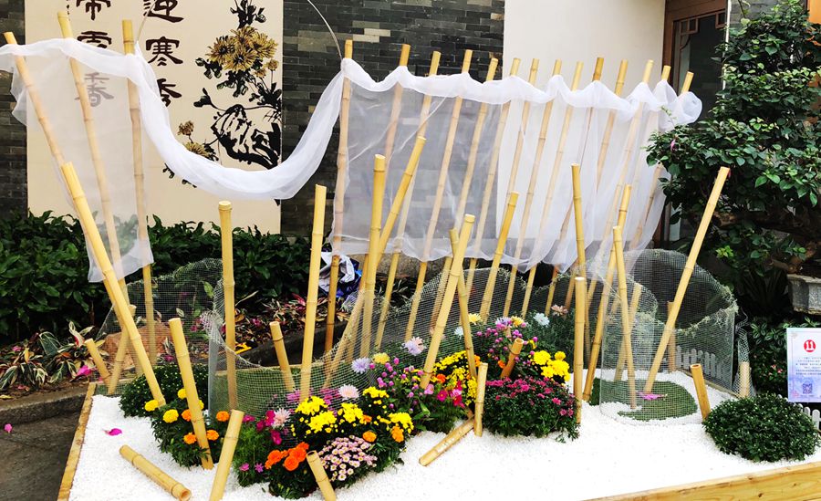 一组的作品名称为《盛世百菊》,菊花与中华元素相结合,创造出一个全新的设计。把竹子进行切割,利用高低落差实现几座山峰叠加,给人层峦叠嶂的感觉,利用白色石子铺装在地面,用河流的形式表示中华的大好河山。中国传统文化中,竹子象征着生命的弹力、长寿、幸福和精神真理。