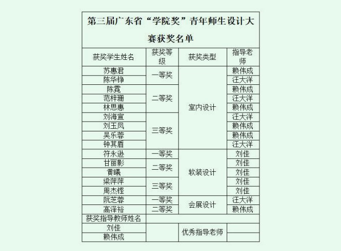 近日,在由广东省工业工会委员会、广东省创意设计产业研究会主办,面向全省各大中专院校和技工院校的《第三届广东省“学院奖”青年师生设计艺术大赛》中,我校艺术设计学院环境设计专业师生荣获18个奖项:其中学生一等奖4项,二等奖6项,三等奖6项,优秀指导老师奖2项。
