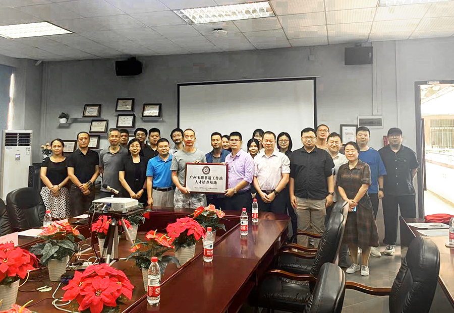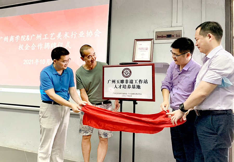 最后,校企合作揭牌仪式中,由林钰源、舒光美、梁伙权和邱锦辉共同为广州玉雕非遗工作站人才培养基地揭牌,并合影留念。