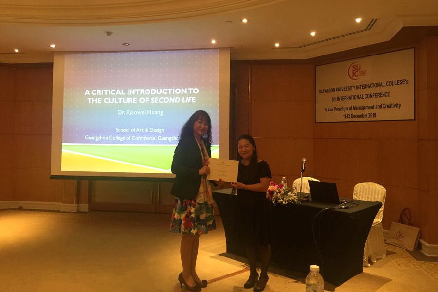 12月12日,泰国艺术大学国际学院院长Sompid Kattiyapikul教授为大会开幕式致辞。维也纳应用艺术大学Gabriela Krist教授以及英国伯明翰城市大学艺术设计与媒体学院院长Alison Honour教授分别致辞。黄小薇的论文主要研究虚拟世界的文化、社会身份认同,作为本次研讨会唯一论文入选的中国学者,黄小薇感到非常荣幸。在会上,黄小薇向在场嘉宾、学者介绍了我们的祖国及自己所在的工作单位广州商学院,并对其论文进行了20分钟的演讲,演讲完毕后回答在场嘉宾、学者的提问。黄小薇的演讲赢得在场人士的阵阵掌声。嘉宾、学者们对黄小薇研究的主题非常感兴趣。汇报结束后,泰国艺术大学国际学院院长助理为黄小薇颁发“入选论文报告证书”。