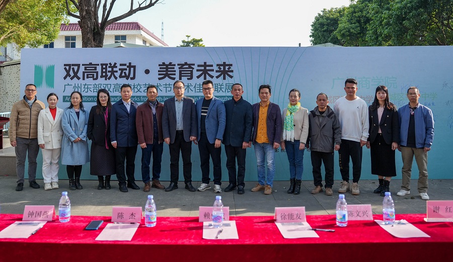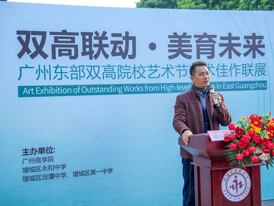 此次联展由广州商学院、增城区永和中学、增城区派潭中学、增城区第一中学联合主办 。出席活动的领导嘉宾有:广州商学院艺术设计学院副院长赖伟成副教授、视觉传达设计专业负责人钟国燕副教授、公共艺术教研室主任蒲艳副教授、校企合作负责人张流畅讲师;增城区教育研究院教研员陈杰;增城区第一中学艺术科组长张薇;派潭中学美术科组长张健文;永和中学党支部书记、校长徐能友,党支部副书记、副校长、工会主席陈文兴,党支部委员、副校长肖荣,政教处主任谢红,总务处主任陈灶陪,团委书记赖海霞,高一级长李新荣,美术科组长赵伟坤。