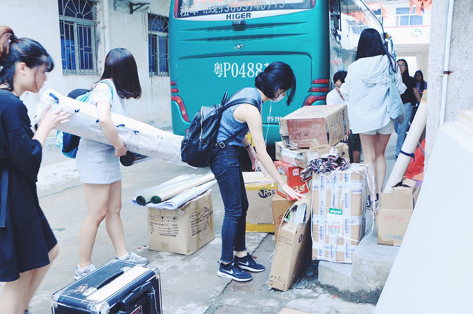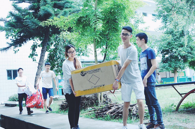 虽然天公不作美,但是并没有影响到师生们激动的心情;大家一路且歌且行,经过3个多小时的车程到达了目的地。由于龙村镇第三小学前巷子限高3米,导致大巴只能停在路口处;全体服务队成员齐心协力,迅速将捐赠的图书、教学用品和宣传用品等几十件物资搬运到校内,大家的满面笑容使接原本静悄悄的校园顿时充满了活力。