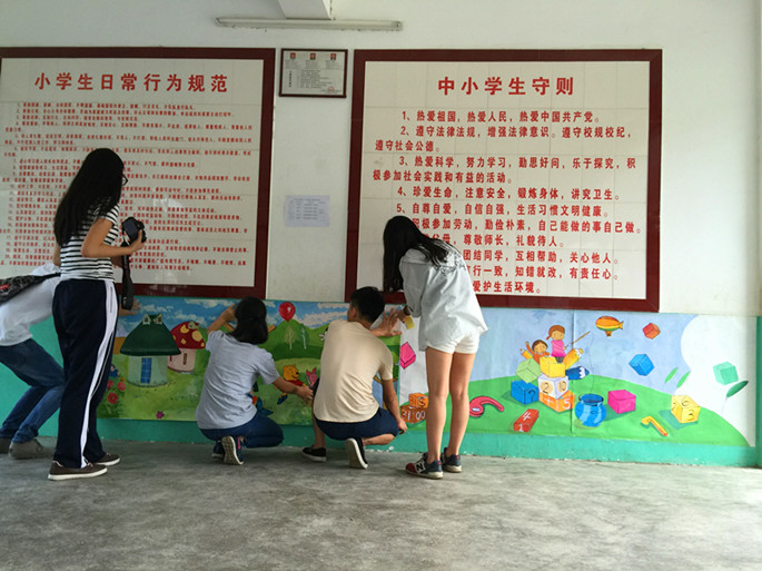 打扫卫生、布置校园,各组队员们都在马不停蹄的积极筹备着接下来十天的实践活动。一天转瞬即逝,夕阳之下龙村第三小学的校园已经呈现出一副新的模样,主教学楼上横幅挂起,彩旗飘扬,校园长廊的漫画引来了附近的村民驻足欣赏。队员们在夜幕下积极备课、彩排、出黑板报,一切为了接下来十天的实践活动能够更加精彩。