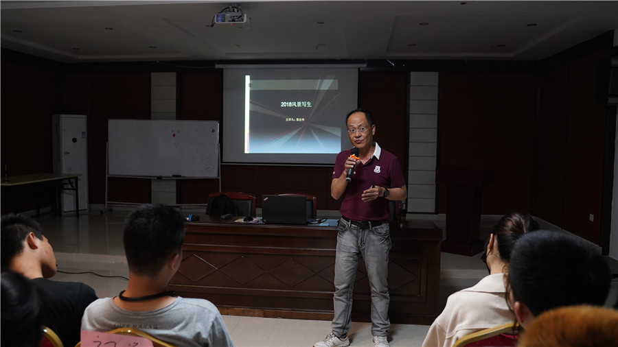 11月16日晚,艺术设计学院在阳江市海陵岛海涛写生基地会议厅组织开展风景写生色彩技法专题讲座,环境设计专业教研室学科带头人黎志伟教授受邀作为主讲嘉宾,讲解风景写生色彩技法。院长助理赖伟成、专业教师黄侃、谢建鹏、李安娜、薛志慧,辅导员关树基,以及2018级全体学生参加讲座。