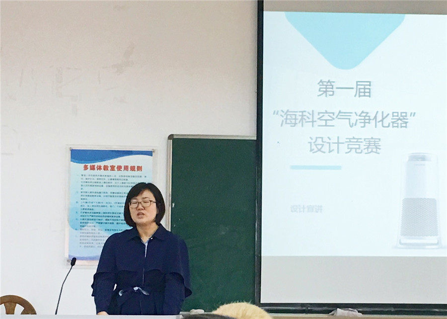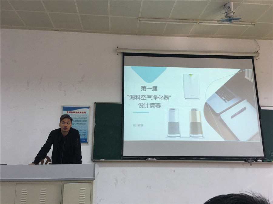 最后,杨清对此次“海科空气净化器”设计竞赛进行了详细的讲解,他结合自身从事产品设计的工作经历讲述作为一名产品设计师应具备敏锐的观察力、勤奋的学习能力等,勉励学生善于观察、勤奋学习,争取做一名好的设计师。他重点介绍了海科电子的企业状况、发展历程、公司规模、主打产品,着重介绍了空气净化器的市场前景、消费结构,产业细分,剖析了空气净化器的外观设计、内部结构、设计亮点、产品技术等,让学生能全方位、多角度的了解空气净化器,从而帮助学生快速认识空气净化器,有效的设计出独特美观、符合市场需求和能够投入生产的产品。