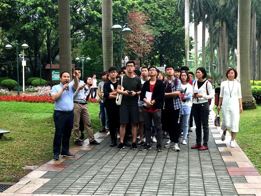 在本次实践课中,黄旭波带领学生从珠江公园南门出发,介绍了景石从开采到运输到现场安装的整个工序,棕榈植物从越南引种到现场种植养护的过程,加拿大与我国友好见证的公园茶室的设计营建过程,挖湖堆山塑造山水园林格局的设计创意过程等公园建设背后鲜为人知的营造故事。作为珠江公园植物造景的主创,黄旭波在带领学生游赏珠江公园六大景区的过程中深入地介绍了园林景观知识,让学生在实践活动中深化对课本知识的了解和认知,加深对书本理论的理解,并通过实践课了解到植物配置的方法,进一步加强绿化造景意识。