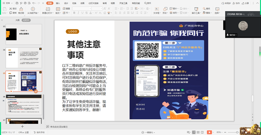 8月18日至19日,辅导员和结对子导师针对复学返校的注意事项向第一批返校的学生开展“学院学生返校工作指引”为主题的线上班会,班会上辅导员详细向学生讲述有关返校前的准备工作、返校途中注意事项、返校之后的日常管理等事项,确保学生返校全过程符合防疫规定。此外,老师还强调要关注“广州防诈服务号”,免受电话诈骗,提高识别和防骗能力,树立反诈骗意识。