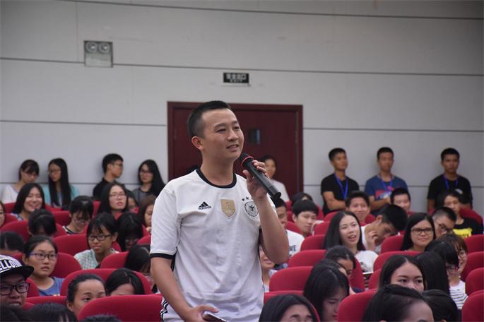 讲座开始之前,已经有众多同学慕名而来,整个会场坐得满满当当的。刘泽楷先与现场学生进行开场互动,为讲座开了个好头,气氛顿时活跃起来。刘泽楷主要从以下几个方面与学生畅谈“谁的大学不迷茫”:一、回顾大学四年的成长经历,虽然担任多项重要学生职务,但是在繁忙的学生工作之余还积极发展自身的兴趣爱好,成为电台的签约主播;二、分享从实习到正式工作的“酸甜苦辣”,讲述自身如何从职场菜鸟成长为公司重要骨干;三、以过来人的身份为师弟师妹提出了一些建议,每个人的成功都不是轻而易举的,人前的“光鲜亮丽”必定带有身后“不为人知的努力”。“不经历风雨的磨砺,如何能目睹彩虹的绚烂?”刘泽楷鼓励学生多参与有利于提升自我价值的活动,要敢于挑战自己的极限,坚信越努力越幸运。他独特幽默的演讲,赢得了大家的阵阵掌声,随后的互动环节,更是把讲座的活跃氛围推向高潮。