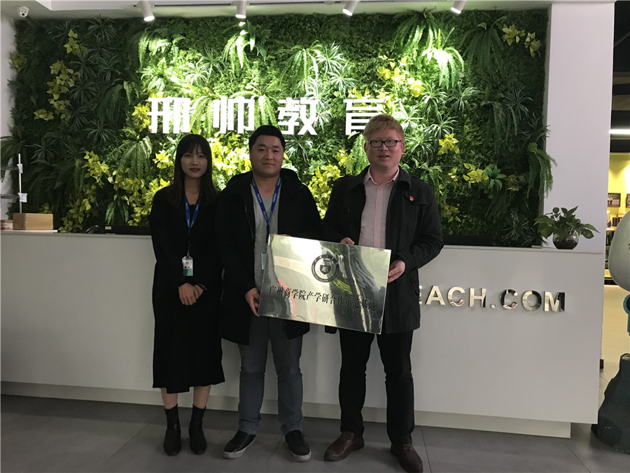 3月8日下午,广州商学院艺术设计学院团委书记、校企合作专员关树基来到广州市番禺区天安节能科技园广州邢帅教育科技有限公司参加产学研合作示范基地挂牌仪式,并就与该企业进行近期校企合作项目推进事宜展开洽谈。邢帅教育校企合作经理黄烨如、国际就业项目经理窦明明等接待了关树基一行。