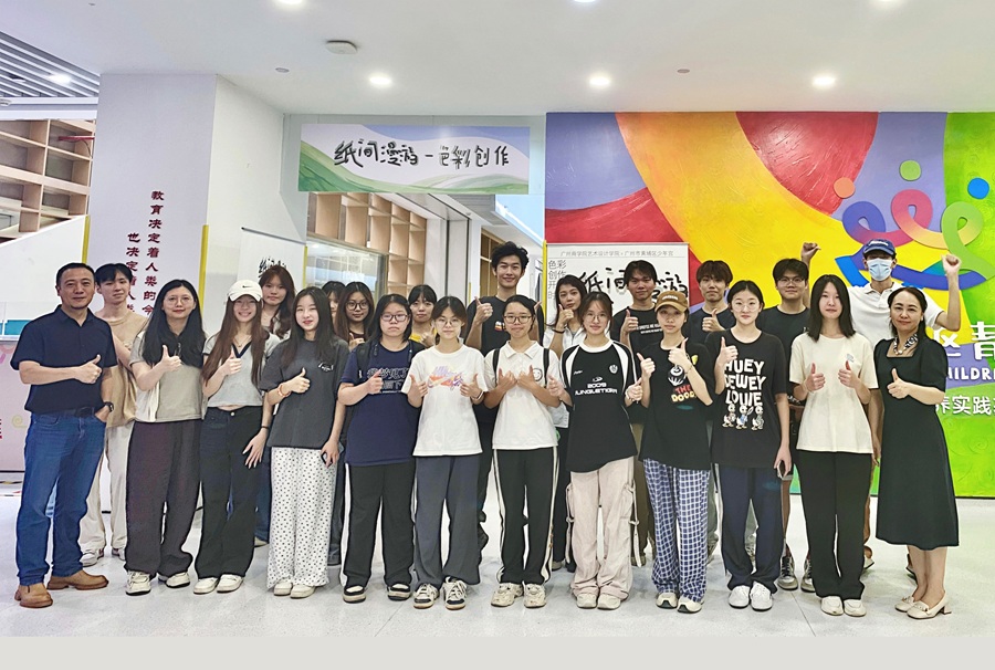 广州商学院艺术设计学院与广州市黄埔区青少年宫知识城精品宫联合举办的《色彩创作》课程成果展暨公共艺术专业工作室成果展于2025年7月2日在广州市黄埔区青少年宫知识城精品宫开幕。本次展览汇聚42件学生原创作品,以"纸间漫游"为主题,通过色彩语言构建起高校美育与社区文化的对话桥梁,生动诠释校地共建的创新实践。