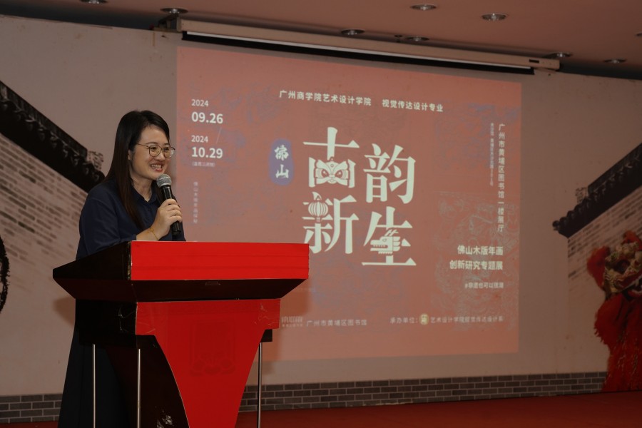 10月10日,由广州商学院,广州市黄埔区图书馆主办,广州商学院艺术设计学院视觉传达设计系承办的“古韵新生——佛山木版年画创新研究专题展”在广州市黄埔区图书馆(大沙馆)开幕,出席开幕式的嘉宾有广州商学院艺术设计学院院长林钰源教授,艺术设计学院专业带头人杨晓旗教授 ,艺术设计学院副院长赖伟成副教授,艺术设计学院院长助理李斯副教授,艺术设计学院视觉传达设计专业负责人钟国燕副教授,艺术设计学院视觉传达设计专业主任罗靖副教授以及视觉传达设计专业全体教师和视觉传达设计专业学生代表。