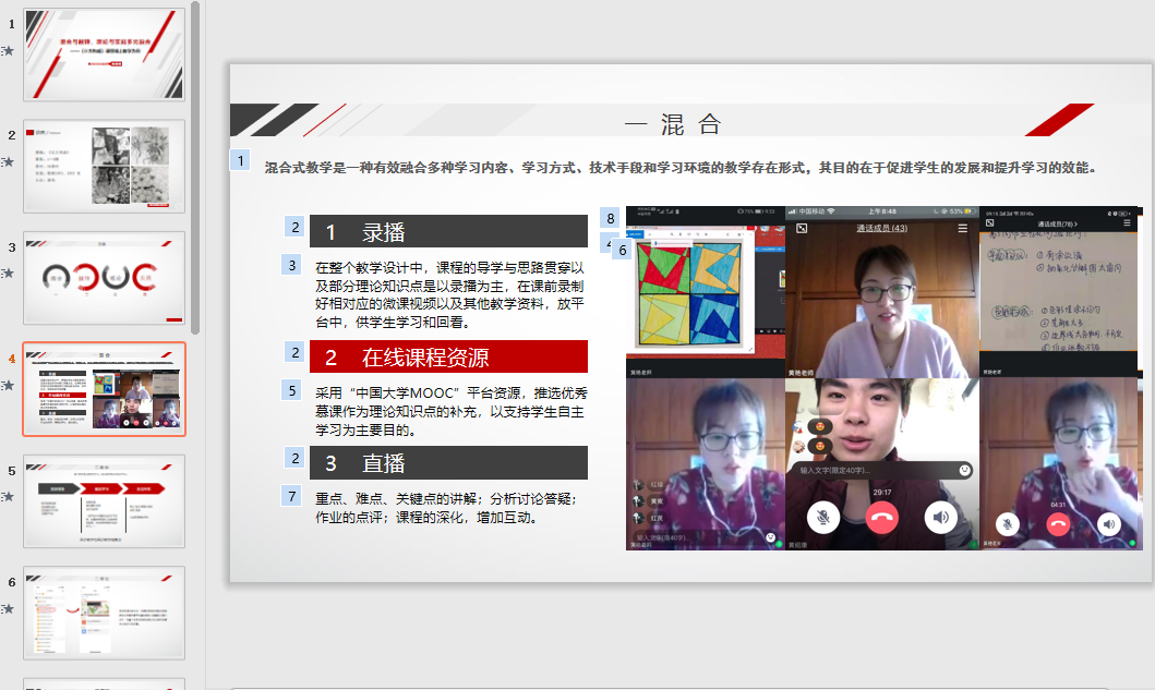 黄艳则以混合与翻转,理论与实践多元融合在线教学为例分享《三大构成》课程的教学经验,主要运用基本理论录播为主,重点难点直播为主,关联知识分享教学资源为主,答疑解惑直播一对一互动为主的四主动教学手段在教学资源准备计划上下功夫,在互动深化上想办法,不断探索以学生为主,教师为辅,教学相长的新式教学方法。在整个课程的在线教学设计中,采用混合式教学方式与课堂翻转的教学手段,达到理论与实际相结合的教学目的,获得学生的一致好评。