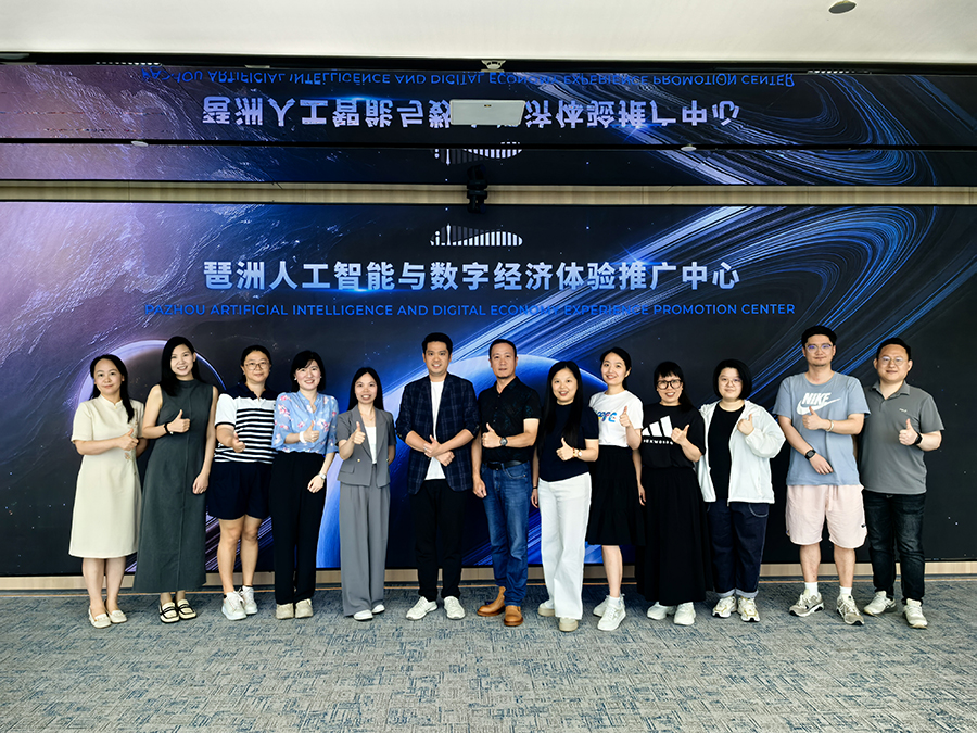 为深入了解人工智能与数字经济前沿动态,探索科技与艺术设计的融合创新路径,广州商学院艺术设计学院一行由视觉传达设计教研室主任罗靖带领于6月28日上午专程赴广州琶洲人工智能与数字经济体验推广中心进行参观交流,由项目负责公司三川田文化科技有限公司党支部书记温周枚接待。