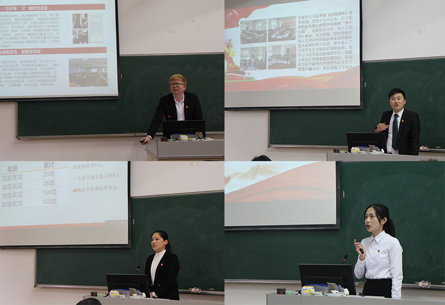紧接着,教工党支部书记吴福珍、2017级学生党支部书记唐思、2018级学生党支部书记关树基、2019级学生党支部书记吴顺利和2020级学生党支部书记蓝喜先后上台向全体师生党员述职。其中,吴福珍汇报通过党员过政治生日、组织开展习近平新时代中国特色社会主义思想学习和组织教工党员志愿服务活动不断强化支部引领,夯实支部建设;唐思则从开展学生党员疫情防控联防联控、组织红色文化讲师团与2020级班级“结对子”开展红色文化教育等方面汇报了支部一年的建设成效;关树基以红色文化教育项目化引领、红色电影周周放、学生党员宿舍网格化管理、学习十九届五中全会和党团知识竞赛等多方面汇报了支部一年的建设成果及凝练的支部特色;吴顺利以开展红色景点学生党员实景课堂教学和红色基因传承为抓手汇报了支部一年的建设成效;蓝喜则以入党启蒙教育、与高年级学生党员“结对子”传播红色文化,营造良好的支部氛围进行了工作汇报。支部书记精彩的述职汇报得到了全体师生党员的一致认可,台下时刻响起雷鸣般的掌声。