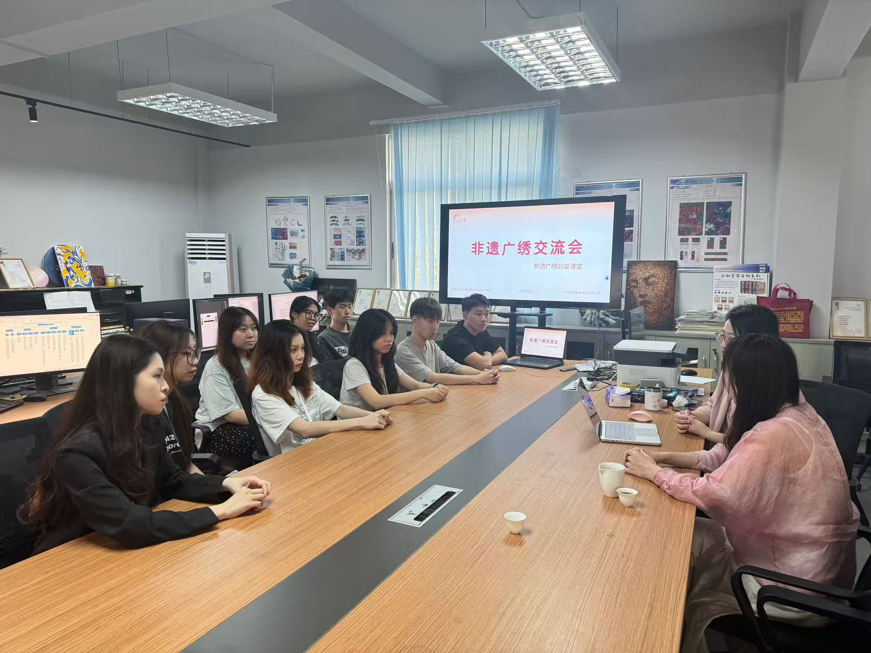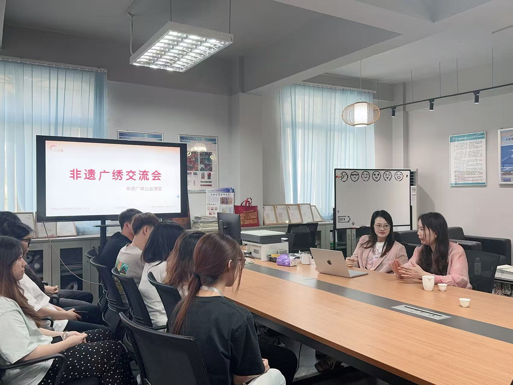 2025年4月11日,由广州商学院艺术设计学院品牌实验研究工作室主办的“非遗广绣传承与创新交流会”在艺术设计学院品牌工作室顺利举行。会议邀请国家级项目广绣代表性传承人、中国纺织非遗推广大使陈乔,以及广州商学院艺术设计学院副教授钟国燕担任主讲嘉宾,与在场师生共同探讨广绣非遗技艺的当代表达与创新发展。