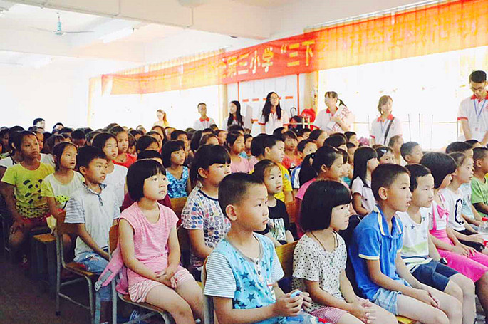 伴随着庄严的奏唱国歌,开班仪式在缓缓拉开了帷幕。仪式上,温东保校长向服务队的到来表示热烈的欢迎和深切的问候,同时也对小学生们提出了要求,希望学生们高度重视本次难得的机会。接着,服务队钟老师对龙村镇、登畲村以及第三小学对本次活动的支持与关怀表示衷心的感谢,并介绍了服务队的概括及活动的开设。随后,服务队队长周莹、第三小学学生分别作代表发言,同时,服务队队员在队长周莹的带领下,进行宣誓,承诺将严守规定,为“三下乡”社会实践活动贡献青春力量。捐赠仪式上,服务队向第三小学赠送了书籍337本,并给150名参加此次社会实践活动的小学生每人赠送一套文具和一个水杯。