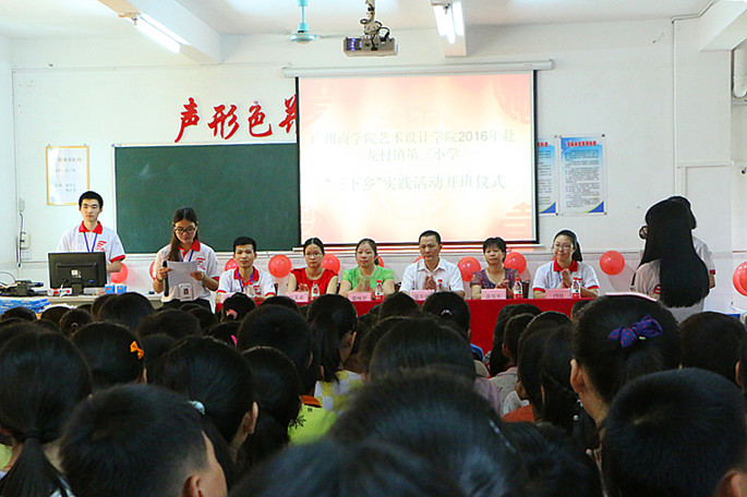 8:00开班仪式如期举行,龙村镇第三小学温东保校长,温书记,温雪芳副校长,温伟兰教导主任,彭玉金教导副主任,以及广州商学院艺术设计学院钟金发老师、邝欣老师出席了开班仪式,参与开班仪式的还有艺希之晨筑梦服务队全体队员及第三小学的140多名学生,开班仪式由服务队副队长罗焱坤主持。