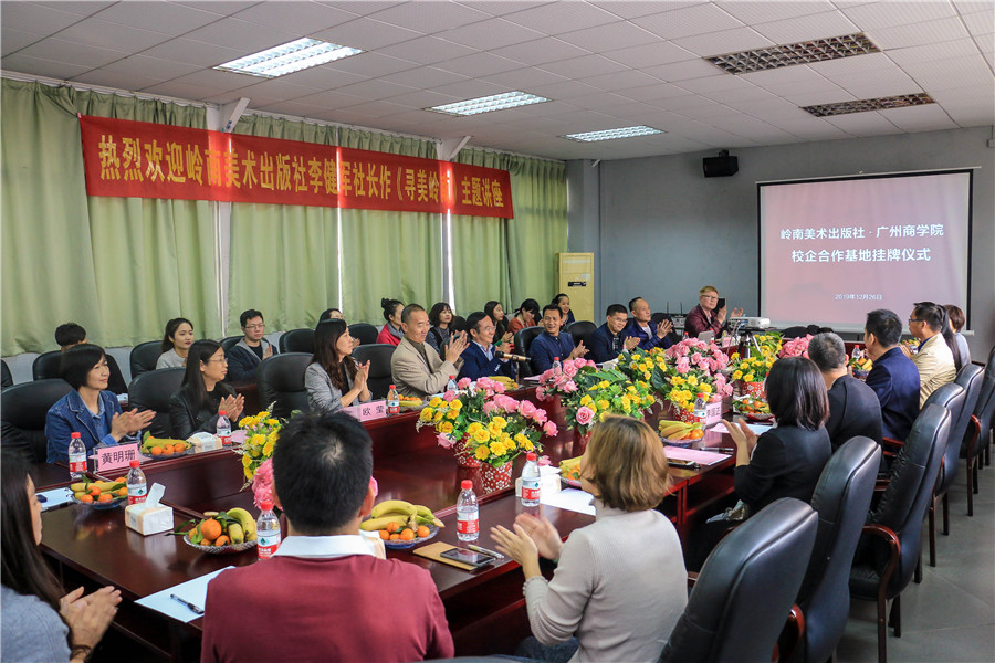在专题讲座环节,李健军围绕“寻美岭南”主题,通过介绍岭南美术出版社的发展史、获奖书籍、与艺术大家合作编辑专著书籍、“寻美岭南”项目架构深入挖掘影像媒体、选题出版、岭南文创和联动互通,传承和发扬岭南文化,不断实践守正创新,专业融合,大匠凝练,讲好岭南故事,做好文化传播媒介阵地,为传承和发展传统文化、岭南文化,为坚定文化自信打下坚实的基础。林钰源在讲座总结中也强调广州商学院立足广东改革开放的最前沿,有着深厚的经济基础、历史文化沉淀和艺术创作积累,他有信心把艺术设计学院的学生培养成有“工匠精神”的“大匠”,甚至也能培养出个把“巨匠”。